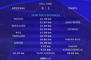 全队平均跑动:阿森纳10.29km 巴黎10.02km